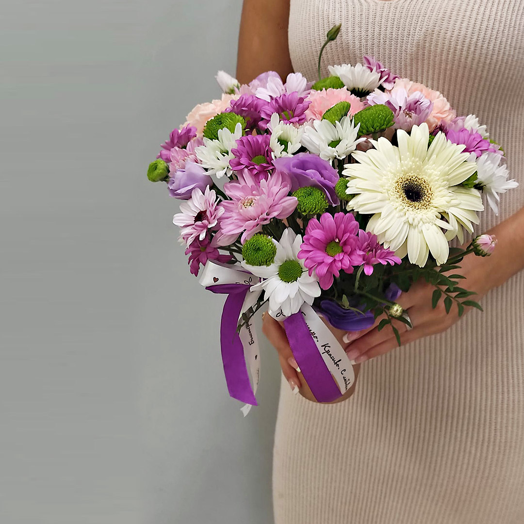• Сумочка с цветами "Яркая" из кустовой хризантемы, роз и гербер арт. 42134